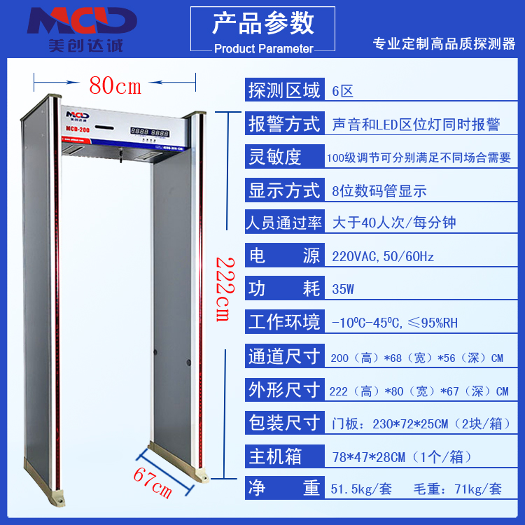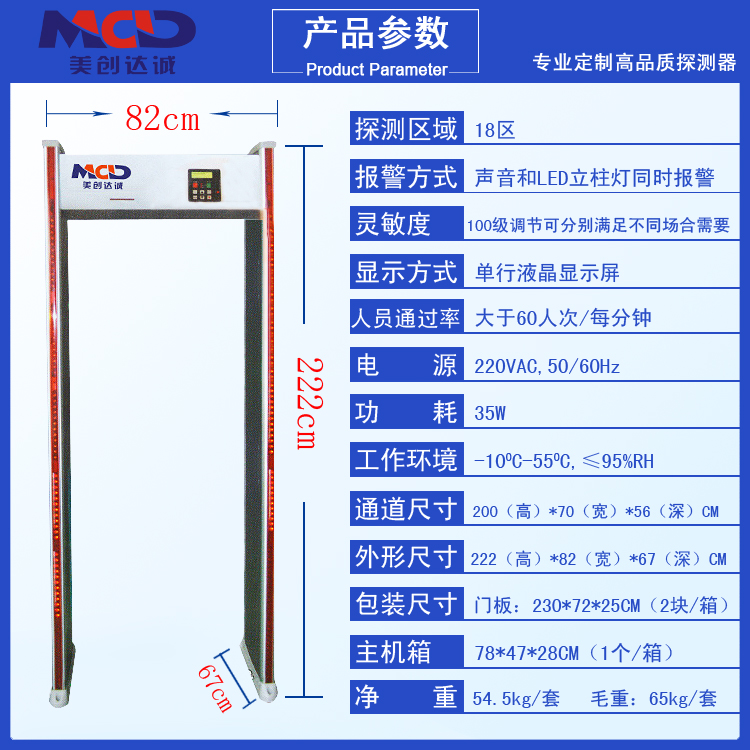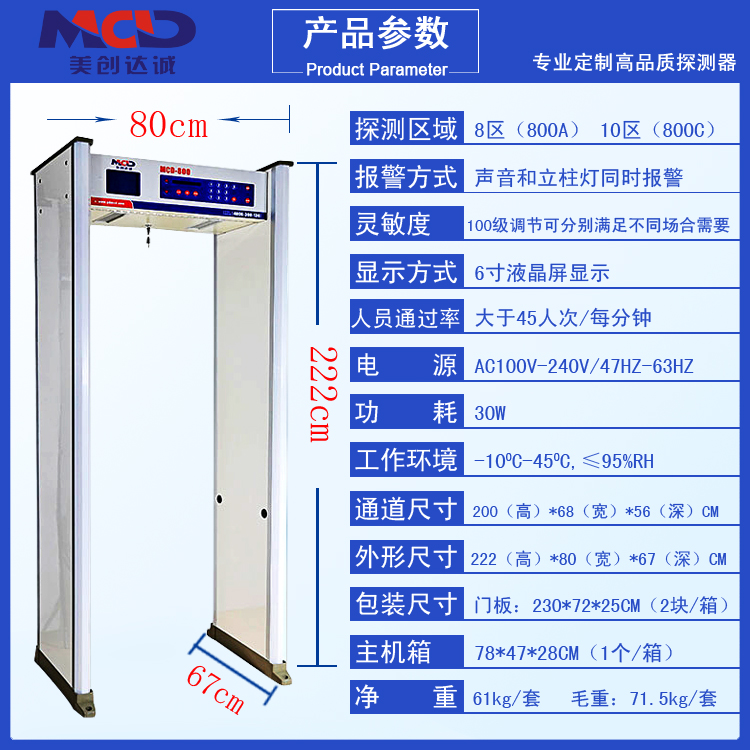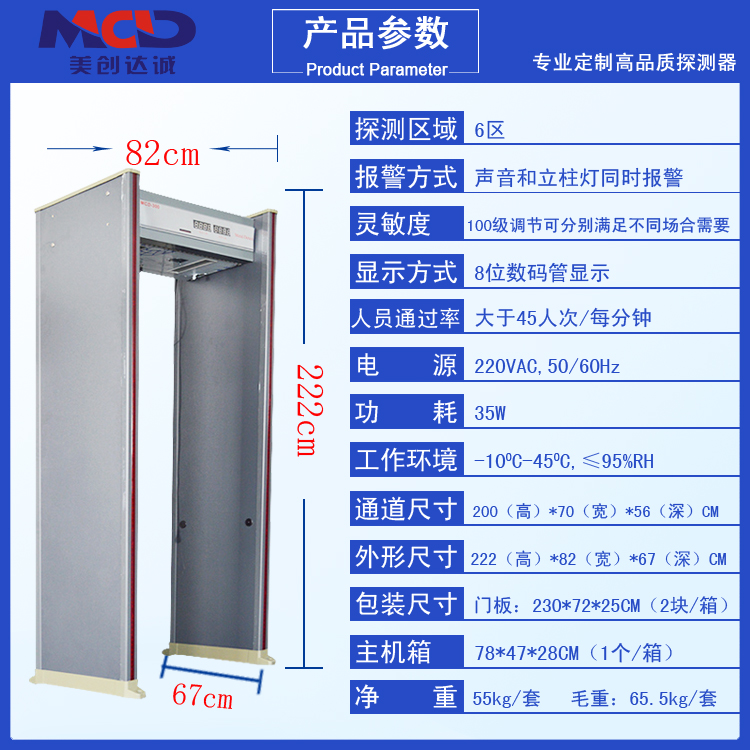 MCD—500安檢門三防設計:防火、防水、防震設計:采用進口防火板為門板材料,有防火、防水、防震、