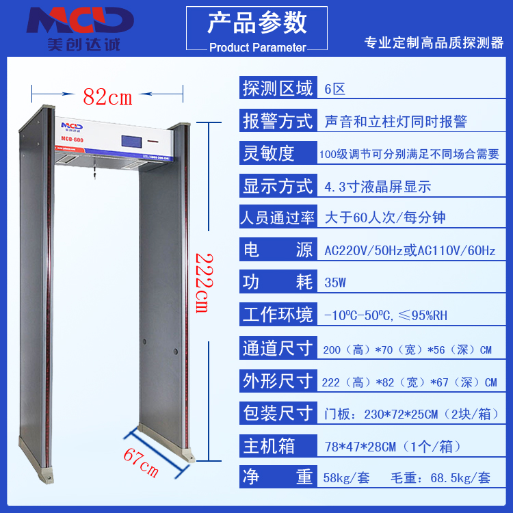 MCD—600安檢門當人體攜帶金屬物品通過時能產生報警的裝置,能準確探測到人身上或手體包箱中攜帶的金屬物品或含有金屬的物品,如各種管制刀具、武器、金屬制品、電子產品及其他含有金屬的物品等