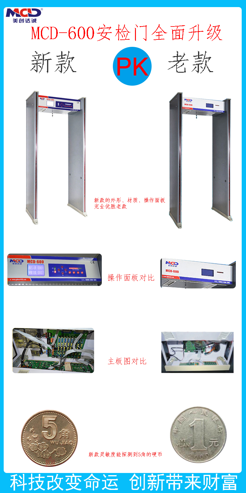 熱烈祝賀我司產(chǎn)品安檢門系列中的MCD-600重大突破和改進(jìn),新款MCD-600安檢門無(wú)論是在外觀、主板路線結(jié)構(gòu)都有改進(jìn),更不可思議的是探測(cè)靈敏度能成功探測(cè)到細(xì)微金屬,如:五角硬幣。