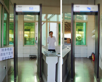 該門是一種結構上做成人可通過的門狀,門的兩邊柱子上安裝了報警高亮度LED指示燈,采用鋁合金做立柱燈條,報警的位置直接的顯示出來、美觀大方。門中建立有電磁場,當人體攜帶金屬物品通過時產生報警的裝置,能準確探測到人身上或手提包箱中的隱藏金屬或含有金屬的物體,如各種管制刀具、武器、金屬制品、電子產品及其它含有金屬的物品等。