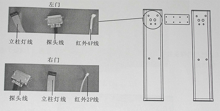 3、把左門(mén)紅外探頭 4P 線和右門(mén)紅外 2P 線分別插到主機(jī)箱控制數(shù)碼板上對(duì)應(yīng)的插座(J6 處)和(J7 處)。如下圖