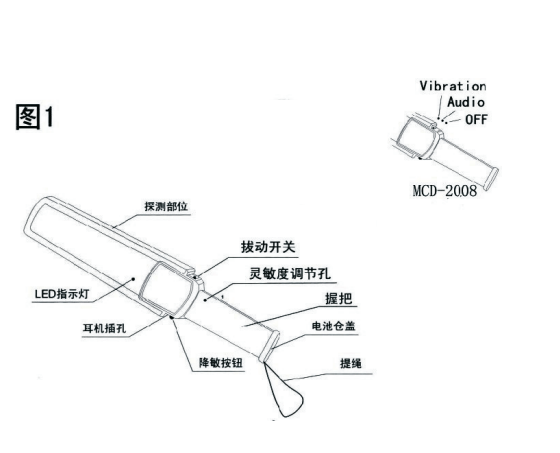 撥動開關設在ON、Audio/Vibration位時開機,在OFF時關機,當關機時會有一短促聲,這是屬于正?,F(xiàn)象,為免電池消耗,應該確保在停用時處于關機狀態(tài),探測器在探測到金屬時,蜂鳴器會發(fā)出聲響,遇大物體是發(fā)出的聲音會久一點,遇到小的物體是發(fā)出的聲音相對的會短一點,當撥動開關置于Vibration,探測到金屬時,內置電機會震動報警。