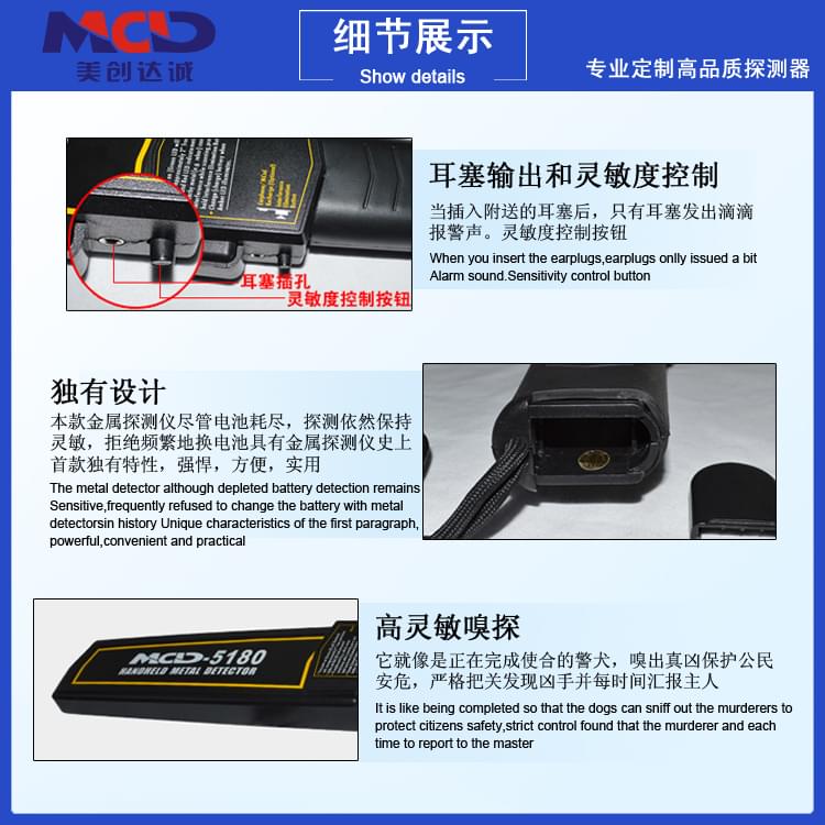 3、低靈敏度測試:如果需要排除掉金屬物中體積很小的物體,可以按住低靈敏度開關(guān)(10)。對被測物周圍探掃,有金屬物時即發(fā)出報警聲音,同時,紅燈亮;停止探掃,聲音即停,紅燈滅。因這時靈敏度降低了 5 倍以上。所以這時測到的一般都是比較大的金屬物。