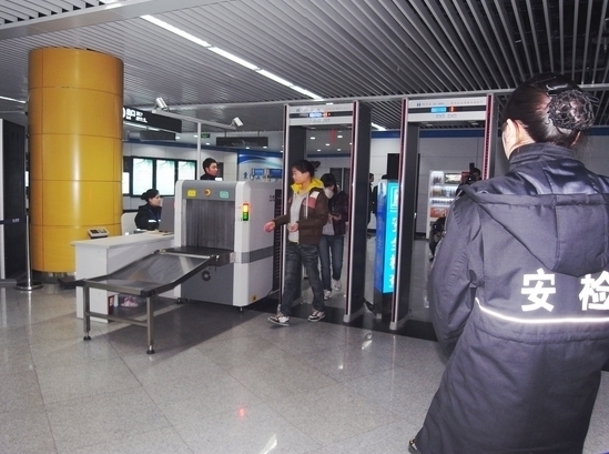安檢門會自動報警,安檢人員再根據(jù)具體情況用“手持安檢器”對其復(fù)查,嚴(yán)禁違禁物品被帶入地鐵。
