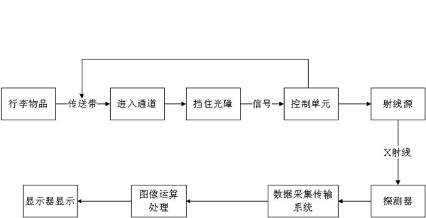 物品進(jìn)入通道式X射線安檢機(jī)通道后,檢測(cè)裝置將相關(guān)信息送至控制單元,由控制單元觸發(fā)X射線源發(fā)射X射線。X射線經(jīng)過準(zhǔn)直器后形成非常窄的扇形射線束,穿透?jìng)魉蛶系男欣钗锲仿涞教綔y(cè)器上,探測(cè)器把接收到的X射線變?yōu)殡娦盘?hào),這些很弱的電流信號(hào)被放大后量化,通過通用串行總線傳送到工業(yè)控制計(jì)算機(jī)作進(jìn)一步處理,經(jīng)過復(fù)雜的運(yùn)算和成像處理后得到高質(zhì)量的圖像。其工作原理如圖所示: